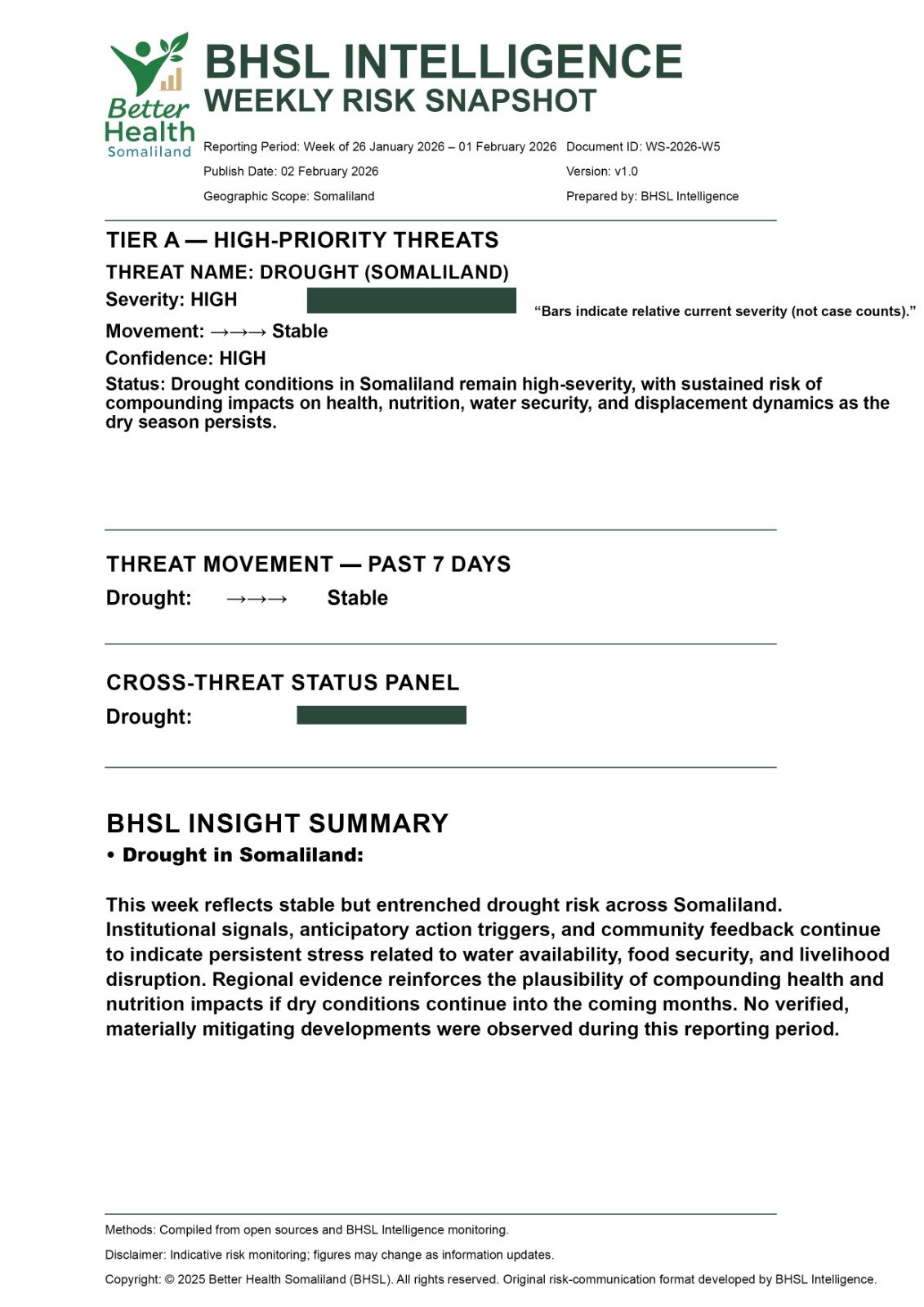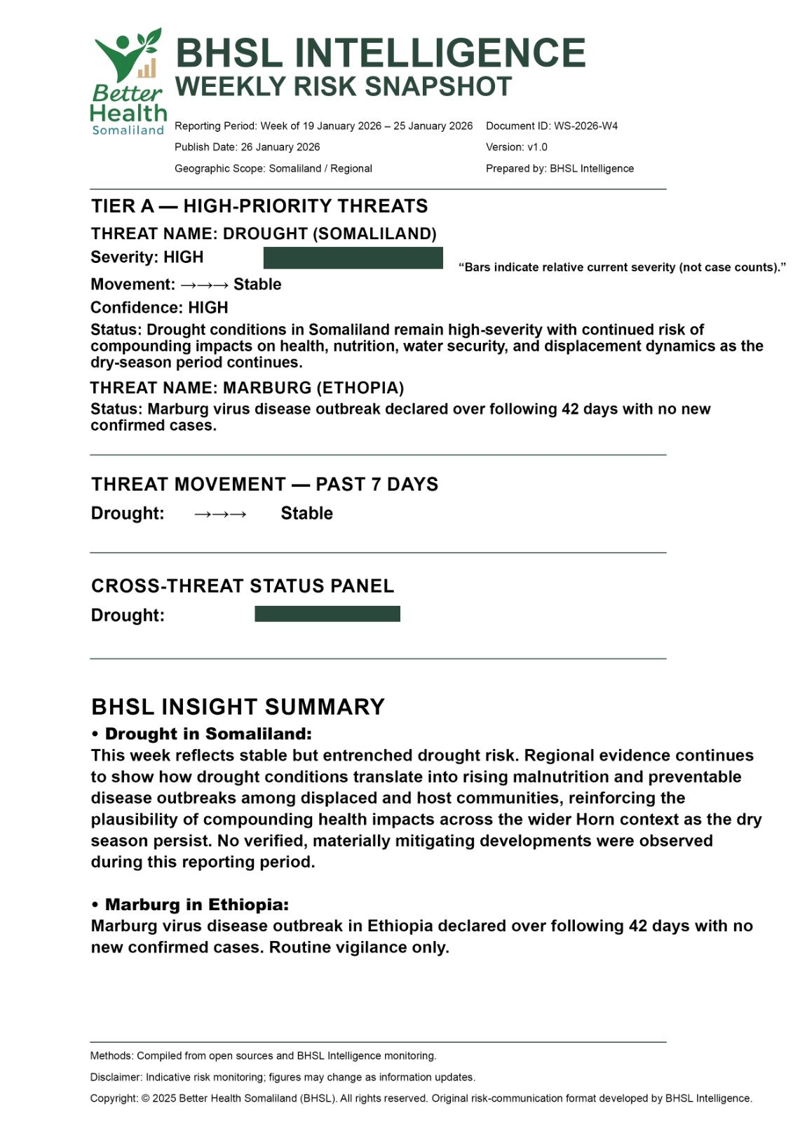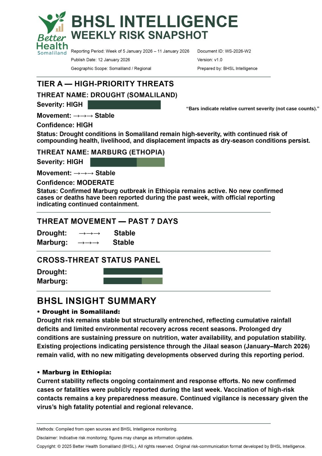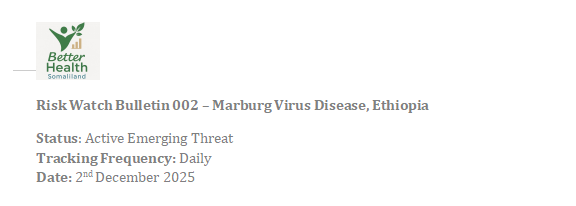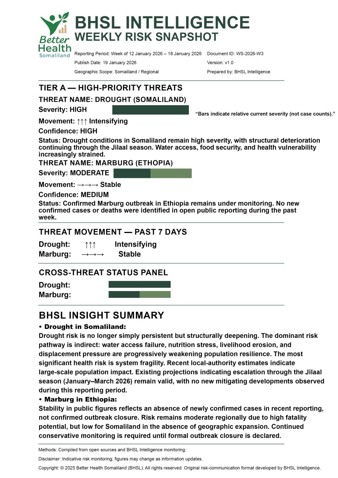 The BHSL Weekly Risk Snapshot provides one-page orientation of key health risks affecting Somaliland and the region. It summarises severity, recent movement, and confidence for each priority threat. The snapshot is published every Monday and is designed to support public understanding, preparedness, and early awareness. This is an orientation product; urgent developments are published separately through BHSL bulletins.